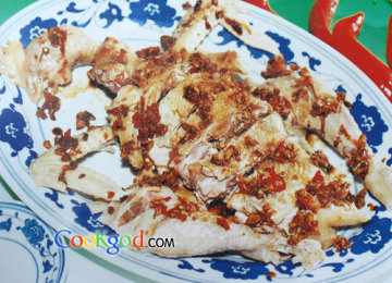 4、将煮好的鸡按件切成条,按原形码入盘内,浇上炒好的汁即成。