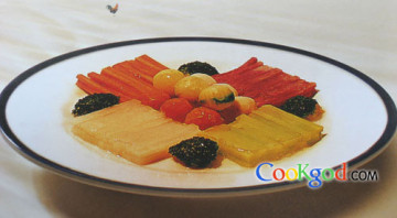 田园瓜菜都是维生素的宝库,也富含矿物质。不同颜色瓜菜的营养成分也各有侧重。田园时蔬的配菜,色泽鲜艳,口感爽脆,营养丰富,能平衡人的膳食,促进身体健康。此菜看似简单,却是接待任务和宴会中的常用的菜肴。主料冬瓜 胡萝卜 西兰花 莴笋 心里美萝卜调料精盐 味精 淀粉