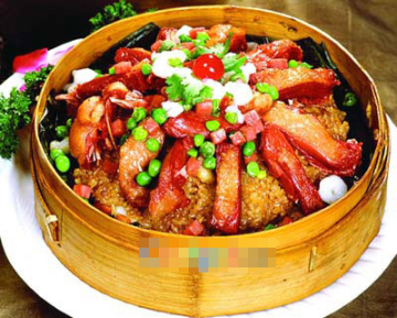 主料:糯米100克,风鹅肉100克,甜豆25克,虾仁25克,红椒粒10克,火腿丁10克,荷叶1片。