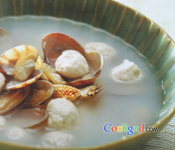 3、炒锅上火,加油烧热,将姜、葱爆香,烹入上汤,放入蛤蜊、羊肉丸煮熟后,加胡椒粉调味即可。