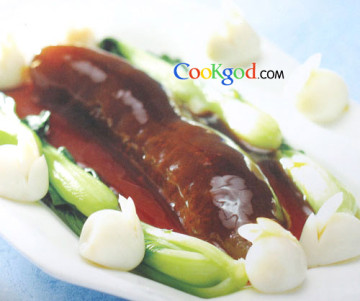 2、炒锅烧热注入色拉油,下京葱炒香,倒入煨好的大乌参,加老抽、盐、鸡汁调味,用淀粉勾芡;将烧制好的乌参装盘,旁边点缀上鹌鹑蛋和菜心即可。