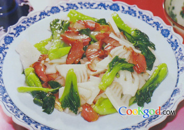 3、虾片、墨鱼片加调料清炒后放在油菜中心。