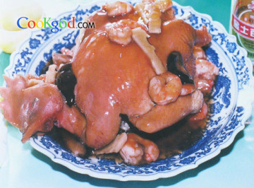 4、汤汁滗入锅内,加入高汤,下入香菇片,冬笋片烧开,下入熟虾仁,加入余下的料酒、酱油,加味精,用湿淀粉勾芡,淋入余下的猪油,出锅浇在盘内鸡上即成。