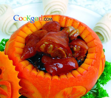 4、炒锅放油,烧至五成热放葱炸出香味,加蚝油微炒,放老汤,再放入猪手和发好的木耳,投盐、糖、老抽、味精,打薄芡,汤汁微大,淋明油即可,倒入蒸好的南瓜内上桌。