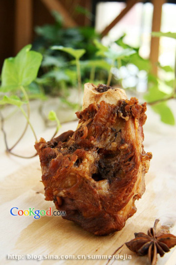 做法:1、 将猪骨放入清水中浸泡两小时,期间换几次水,去除血污;2、 将猪骨放入冷水中,水沸撇去浮沫,捞出猪骨;3、 另煮一锅热水,水将沸时放入焯过的猪骨,放入料酒、生抽、老抽、白糖、盐、黄酱、山楂、桂皮、花椒、大料、陈皮、香叶、丁香等调料,大火煮沸,小火继续煮一个小时;4、 改中火或大火再煮半个小时,收一下汤汁即可。