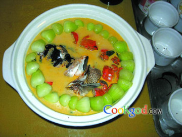 河蟹6只(约600克),大鱼头半边(约750克),小油菜100克,洋葱10克。调料盐10克,矿泉水高汤1500克(用矿泉水熬作的高汤),牛油20克,色拉油75克。