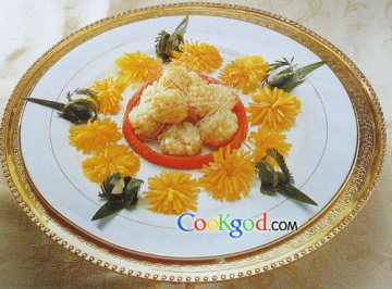 2、将冬瓜改成菊花形,调味,拍吉士粉炸出,摆入盘中。