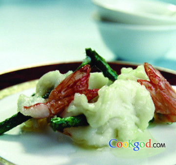 芦笋100克,六头竹节虾5只。调料蛋清5克,上汤30克,色拉油500克,盐2克。