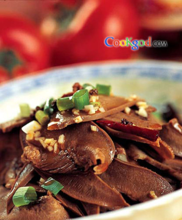 3.锅内放油,烧热,爆香花椒、蒜、香葱、辣椒段,倒入猪舌片、盐、酱油,爆炒出香味,放入味精、香油即可。