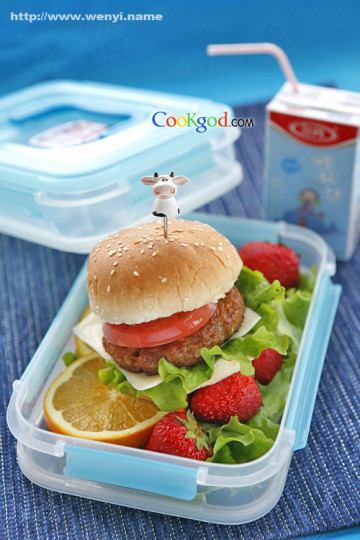 **一份营养早餐,需要有谷物,肉类,蔬菜,乳制品和水果。虽然我们的汉堡已经包括了谷物(面包),肉类(牛肉馅),蔬菜(胡萝卜,洋葱,生菜,西红柿),乳制品(奶酪),但妈妈们还应该再给孩子额外增加一盒牛奶,及少许时令水果,这样的搭配,才更加完善。