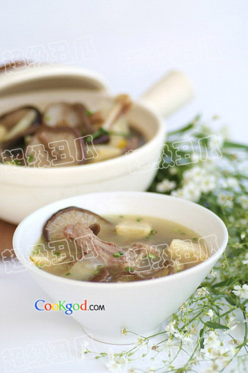 2.与茶树菇入锅烧开文火煮两小时,下盐调味就好了。