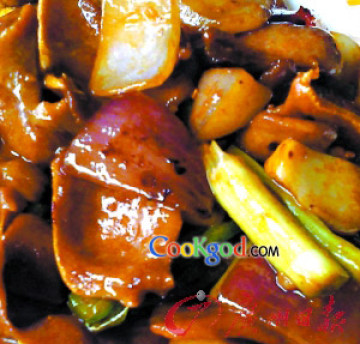 (2)、炒锅内放香油35克,烧热,入姜末稍炸后,烹入料酒,加白糖,再加番茄酱炒出香味后,加净水150毫升调开,再将牛舌推入锅内,加入姜、醋,见开后用文火煨,待汁基本收尽,稍淋点淀粉,加入香油,出锅装盘即成。