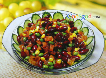 主料萝卜干100克辅料青豆25克,红豆25克,玉米粒25克,黄瓜片适量。调料精盐5克,味精5克,白糖5克,葱花10克,蒜泥5克,泡椒15克,香油10克。