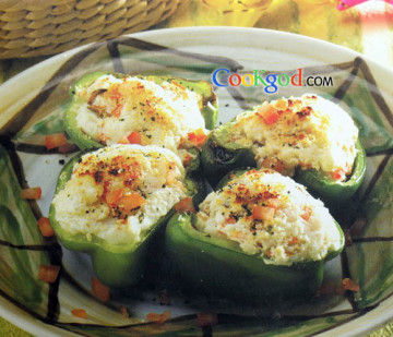 3、青椒洗净切半,去籽,填入馅料,烤盘中涂上色拉油,摆入盘中,放入烤箱以200℃烤至表面焦黄即可。
