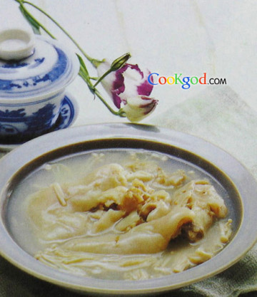 2、将猪蹄、金针菇放入净锅内,倒入适量清水,煮至菇烂、蹄脱骨,加入精盐、味精调味即成。