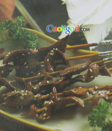 用椒香汁(五香粉、香菜子粉、白胡椒粉、香叶、黄酒、汾酒调成)腌渍,称为椒香烤羊腰。