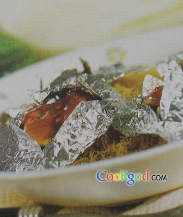 3、将备好的松茸切成花刀,刷上五香酱,包在锡纸内放入200摄氏度的烤箱内烤熟取出将锡纸打开,置于土豆松上即可。