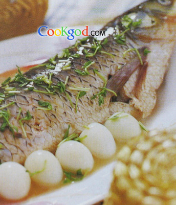 2、草鱼去鳞,去内脏,洗净后膛内填入鸽蛋,加料酒、精盐.味精,清汤,放笼屉中蒸熟,去汤汁,勾流芡淋鱼上,撒上豌豆苗。