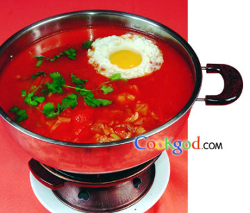 2、平底锅内入色拉油,烧至五成热时,放入鸡蛋小火煎1分钟成太阳蛋;西红柿切重约5克的块待用。3、锅上火放入色拉油,烧至七成热时,入葱段、姜末、蒜片煸香,下西红柿块中火炒2分钟至烂,调入番茄酱、番茄沙司小火炒匀,放入鸡汤、牛腩小火烧10分钟,放盐、味精、鸡精、白糖、美极酱油、胡椒粉、二锅头调味,用生粉勾流水芡,盛入明炉,再放入事先煎好的鸡蛋即可。