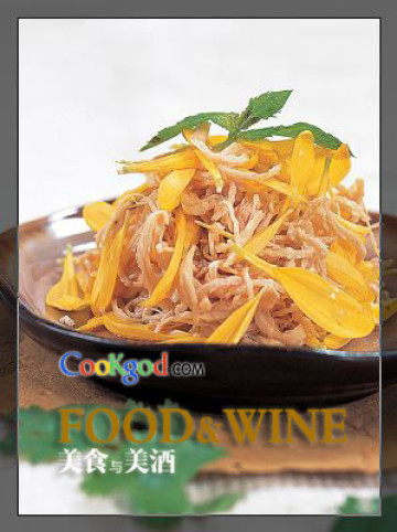 烹饪心得:鸡丝码味时可加入少量的蛋清效果更佳。菊花食用前需先用盐水洗净,但不可浸泡太久,以免破坏菊花的组织结构和营养风味。