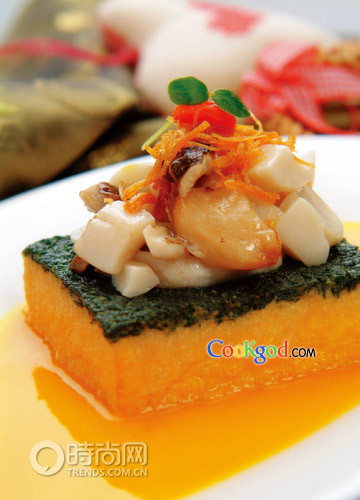 3.白玉菇、蚧味菇、瑶柱生炒调味,点缀菜品上,盘底入金瓜汁。
