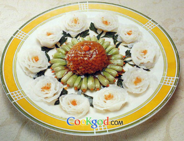 2、将墨鱼打成胶,挤成牡丹花形状,入沸水锅汆透。