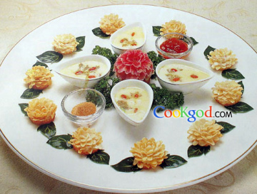 2、鹅肝切成小丁,放入盛器中,加入鸡蛋液拌匀,调味,上笼蒸熟,摆在盘中间。