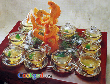 水晶冬瓜翅、金瓜龙舟蒸辽参、福寿重阳、淮山柴把明笋