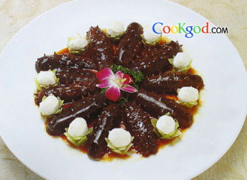 3、将大乌参放入容器内,入蒸锅用大火蒸至熟透取出,摆入盘内,鱼丸围摆大乌参周围。锅内放入清汤,加入余下的料酒、葱姜汁、精盐、白糖、烧开,加入余下的味精、用湿淀粉勾芡,出锅浇在盘内大乌参、鱼丸上即成。