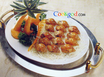 4、炒熟后装蜗牛壳内,用蛋泡糊封口,上笼蒸约一分钟,取出装盘即可。