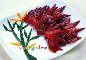 2、八角、香叶、桂皮、白豆蔻、葱、姜放入烧至五成热的色拉油中小火煸炒15分钟,放入二汤小火煮沸后去污物,加盐、糖、鸡精、红曲米、南乳汁小火煲3小时,放入鸡冠小火煮20分钟,捞出装盘,用黄瓜片、胡萝卜片装饰即可。