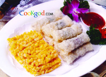 泰国丝网皮(可用糯米纸代替)10张,山菜菌100克,菠萝丁40克,虾仁丁30克,玉米粒150克。调料盐6克,味精、湿淀粉各10克,泰国鸡酱50克,生粉30克,色拉油500克,鸡蛋黄50克。