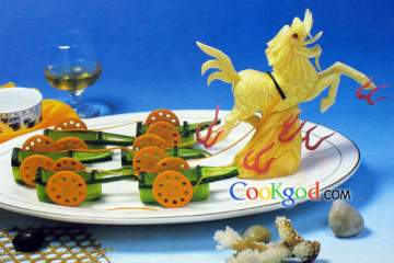 2.用地瓜雕成麒麟,将麒麟和小车用细萝卜丝连接起来即可。