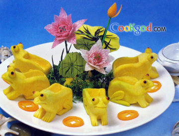 2.用心里美萝卜雕几朵荷花立在盘中,配上些荷叶和法香,再在青蛙之间摆上用胡萝卜雕好的金钱即可(也可用香菇制成酿金钱菇代替)。