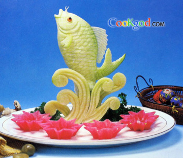 1.先雕一条跳跃的鲤鱼摆在盘中,配上浪花。