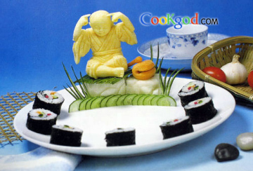 1.先用地瓜雕出一休,摆在盘边,用胡萝卜雕出一只木鱼,黄瓜皮戳几株小草,摆在一休的身边。