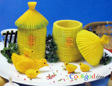 1.先用牛腿瓜雕出两个粮仓,摆在盘中。