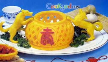 1.先用半个圆形南瓜雕出一只竹篓,摆在盘中。