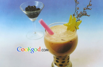 ①主料:清红茶120毫升,咖啡粉8克,特调奶精粉6克,糖水22毫升,冰块100克。②配料:煮熟黑珍珠粉圆30克,吸管1支。