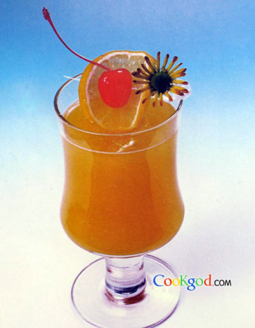 2、摇晃后倒入杯中,再冲入雪碧,加上装饰物即成。