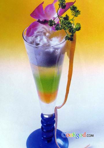 配方:蜂蜜1/3盎司,薄荷蜜2/3盎司,凤梨汁1/3盎司+1/4盎司,葡萄浓缩汁1/2盎司,鲜牛奶2盎司,金酒1/3盎司,七喜汽水1瓶,冰块1杯