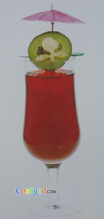 2、摇匀后倒入果汁杯,杯边缀上小伞和奇异果等。
