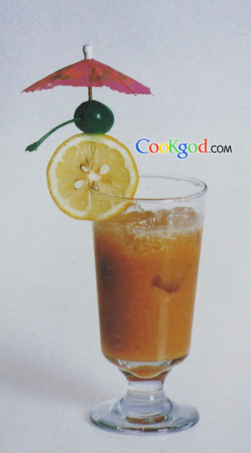 配方:葡萄汁1盎司,鲜牛奶1盎司,凤梨汁1盎司,蜂蜜1盎司,金酒1/6盎司,柳橙汁2/3盎司,冰块1杯