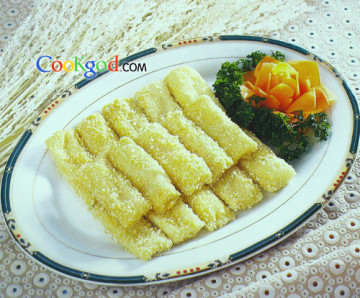 1、鲜贝、虾仁洗净用开水焯好,同蟹柳切成丁,加盐、味精、姜汁、卡夫奇妙酱搅拌成馅,用威化纸包卷,粘鸡蛋液,滚粘面包渣。