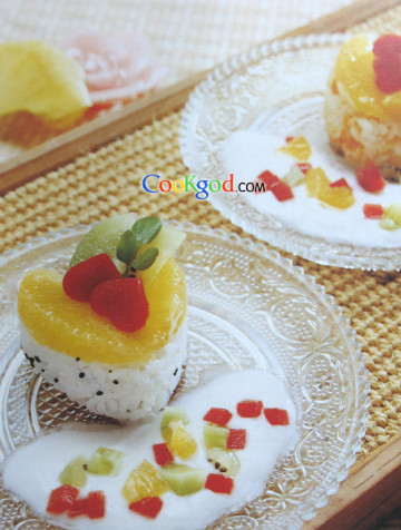 寿司饭300克,黑芝麻适量,橙子1个,奇异果1个,山楂糕150克,薄荷叶少许,酸奶适量。