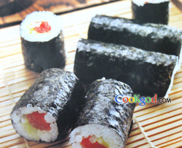寿司饭300克,新鲜金枪鱼条、芥末、寿司纸(海苔)各适量。
