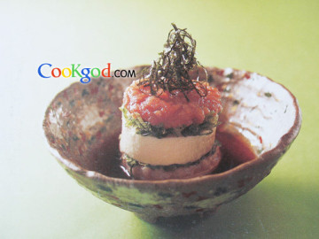豆腐配吞拿鱼腩是优雅又传统的菜式,因为豆腐和青葱是日本人的典型食物,吞拿鱼腩属高级食材,一粗一细的材料,一白一绿一暗红的色调相间,属清、雅并存的特色菜肴。分量:1人预备时间:10分钟
