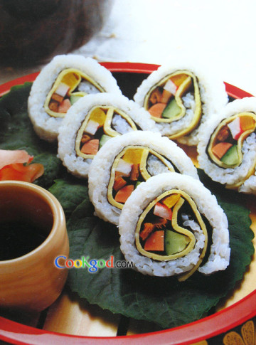 寿司饭300克,蛋饼1张,黄瓜条、火腿条、胡萝卜条、蟹肉棒、大根条、香菇条、寿司纸(海苔)各适量。