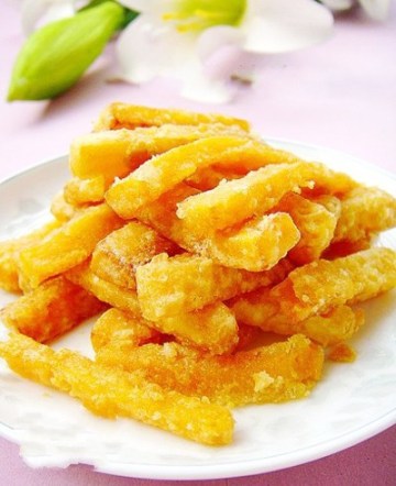 2、腌完的南瓜条要多放干淀粉,要是放少了炸过后南瓜会回软。