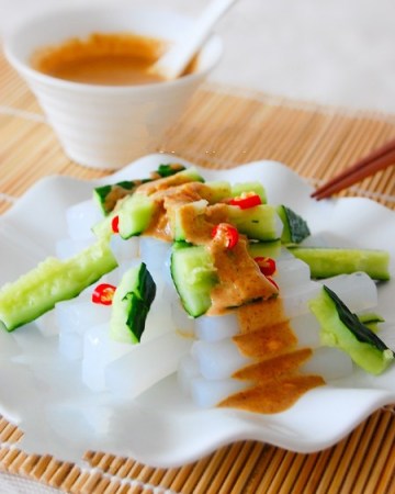 4。把事先拌好的芝麻凉拌酱浇到凉粉上,吃的时候拌匀即可